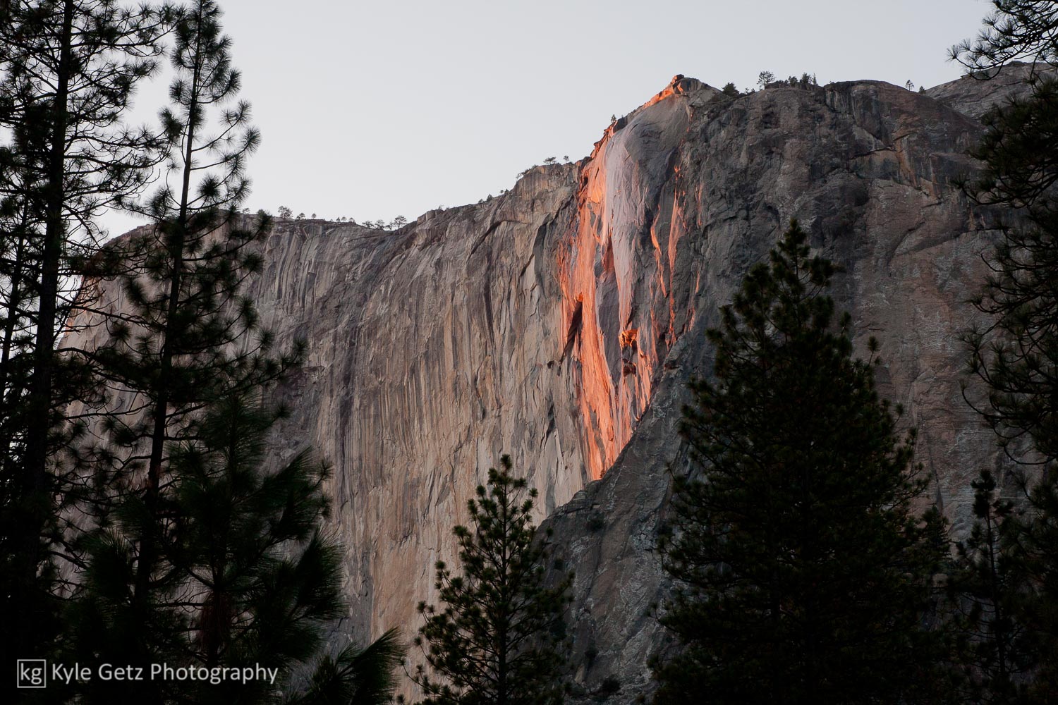 In the evening, along with hundreds of other photographers, we made our way to a clearing to capture the Horsetail Falls firefall, which can be seen for only a couple weeks out of the entire year. The firefall effect is a combination of the rock formation of the falls, flowing water, and the angle at which the sun hits the falls in the evening. There wasn’t much moisture on the falls, so the overall effect wasn’t as fiery or lava-like as I’ve seen in other photos, but the photo actually came out nicer than I thought it would: