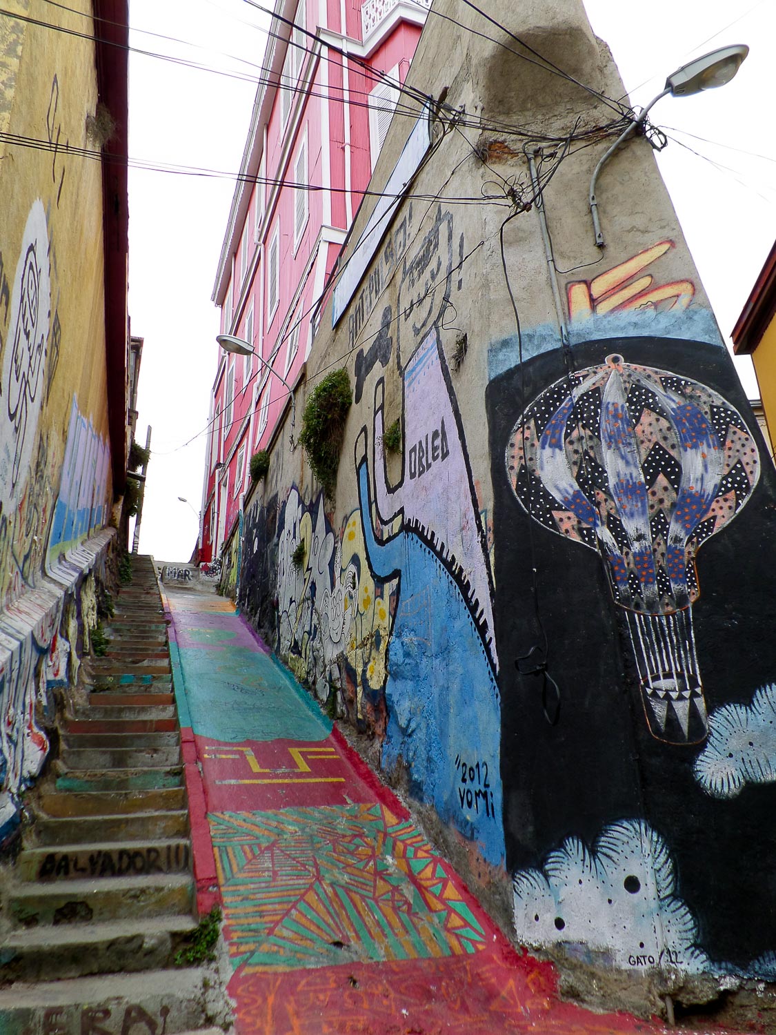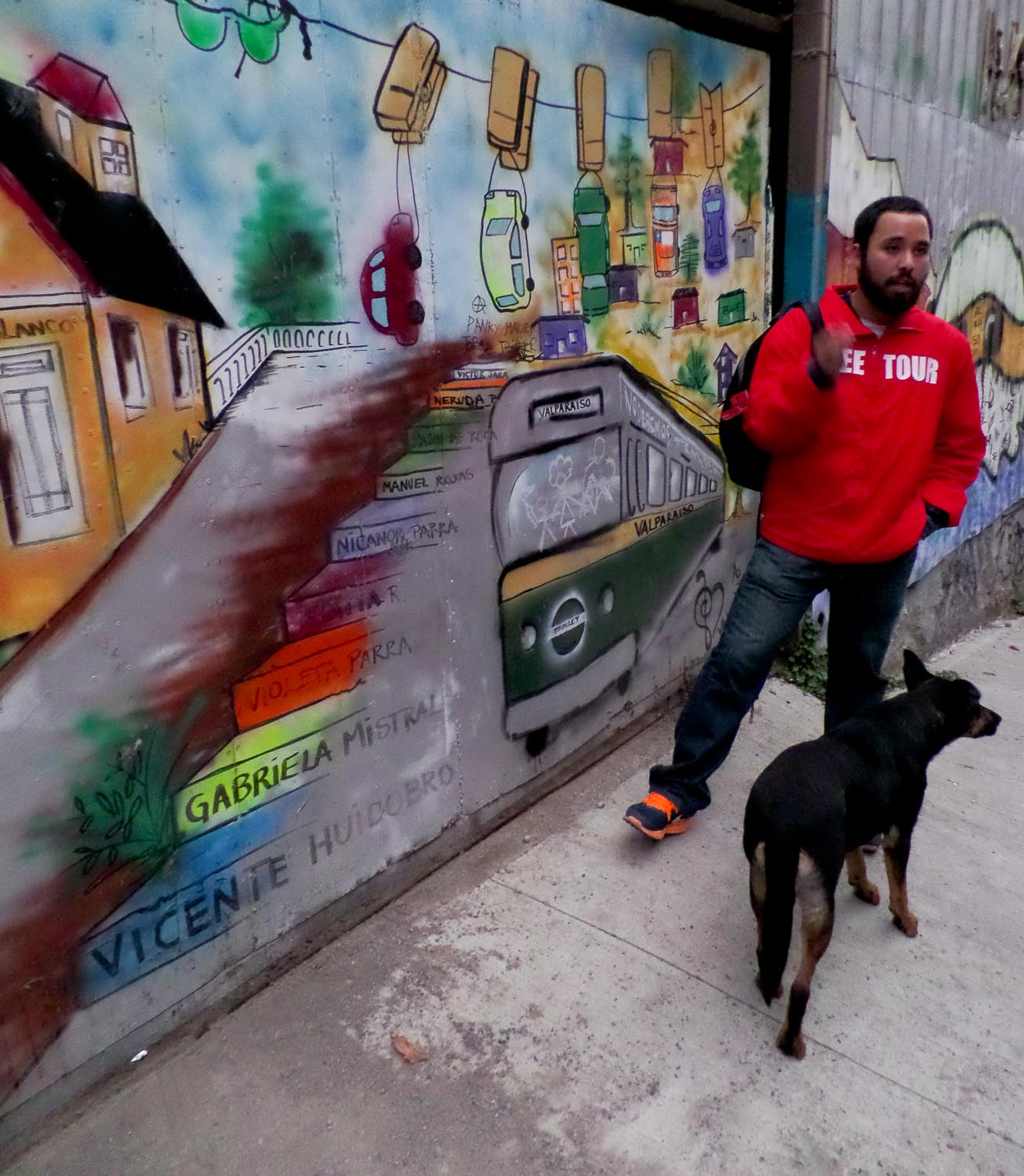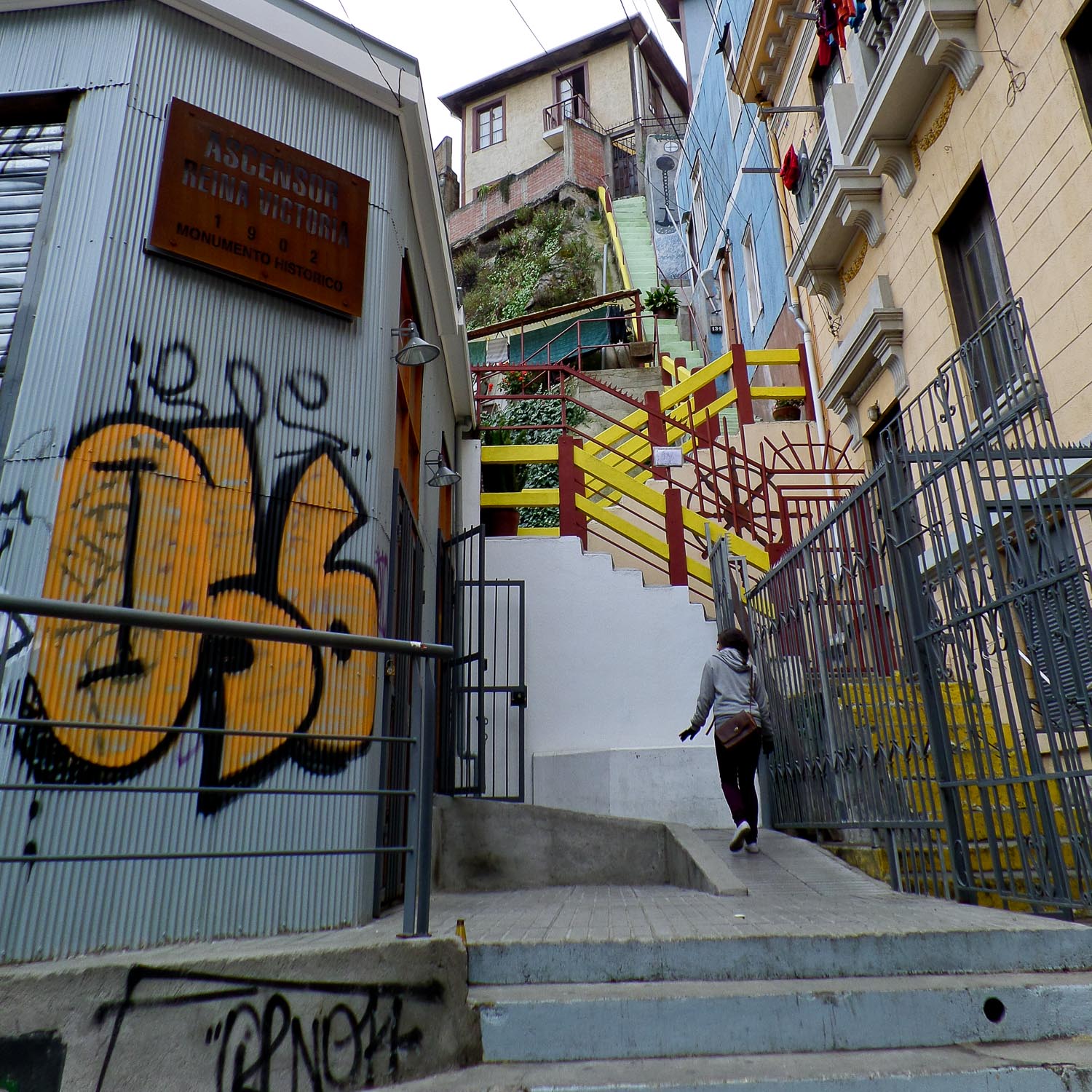 Just like the Santiago walking tour, the Valparaiso walking tour was English-language, free (except for tipping the guide), and very interesting and informative. Israel was no Filipe, but he held his own quite well. We walked along the hills, side streets, and staircases of Valpo (as it’s known to locals), taking note of the unique architecture, wall art, and graffiti everywhere. Santiago may be the capital of Chile, but Valpo is arguably the cultural capital. It was also peculiar to see vegan-related graffiti in quite a few places (literally the word “VEGAN” spray painted on walls); Israel told us that veganism and vegetarianism are popular among the city’s many university students. The tour also took us on a couple of the city’s funiculars, which transport people up and down the very steep portions of some of the hills.