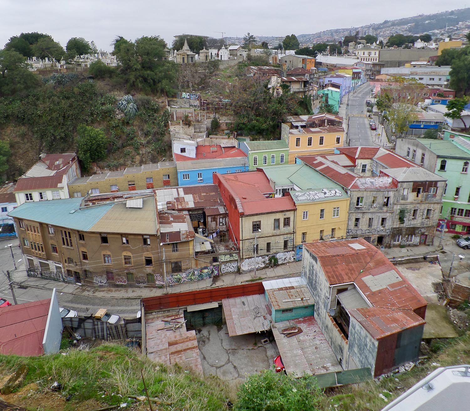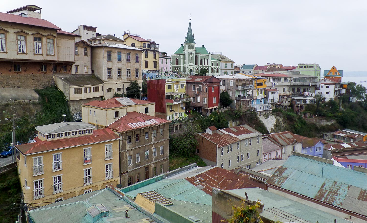 As the sun set and the fog rolled in and the temperature dropped, we started to make our way down the hill back towards town. The roads on Valparaiso’s hills are a bit disorganized and confusing, so we had to follow the taxi routes to figure out how to navigate ourselves back down to sea level. We even picked up a four-legged buddy on our way, the first of many furry companions to join us on our travels. He looked quite dashing in his scarf as he guided us down the hill and through part of the town below.