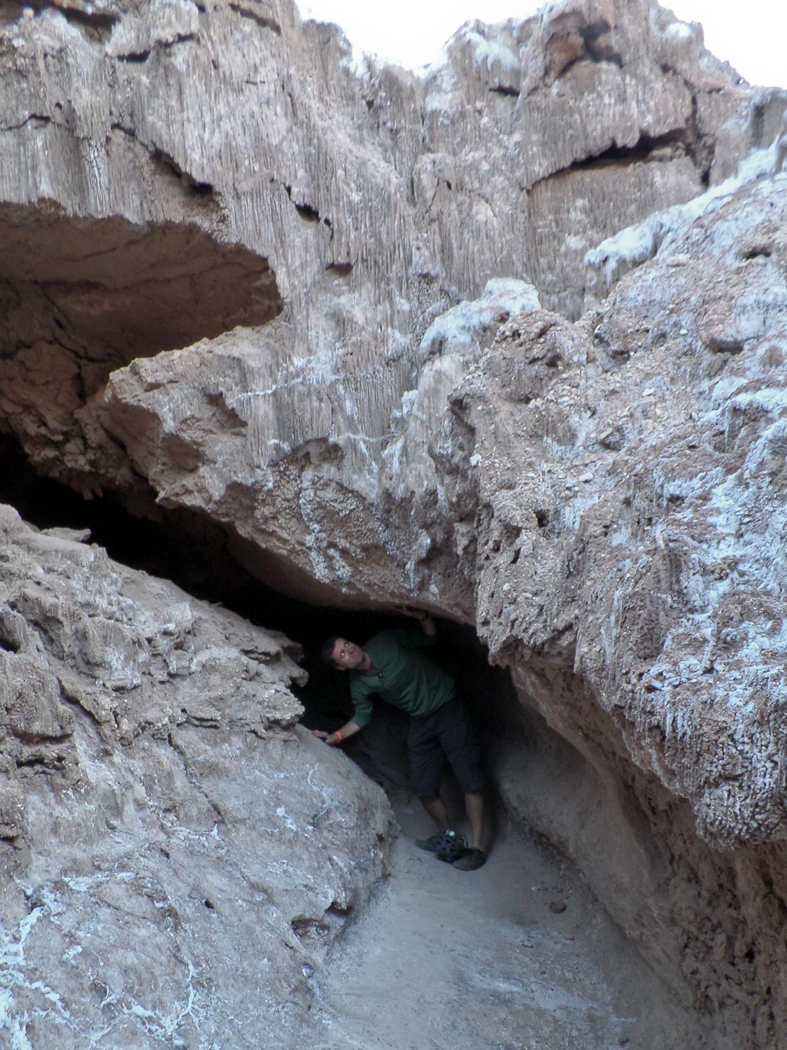 After lunch, we rented bikes and rode about six miles to Valle De La Luna (Moon Valley), which has a variety of natural attractions and great views of the Andes. (Truth be told, I rode a bit further than six miles, because not two minutes after we left the bike rental place, my front tire exploded, resulting in a sheepish walk back for a repair.) We arrived in the valley in the late afternoon and, funny enough, ran into a backpacker we had met back in La Serena. We had only a little bit of time before the setting sun would cause a steep drop in temperature and he suggested visiting the salt caves. We rode to the caves and wandered around, using the handy miner’s lights we had received when renting the bikes. The valley was so quiet (provided there wasn’t anyone else within earshot) that when we sat down at the caves and listened without moving, we could hear the cracking of the salt.