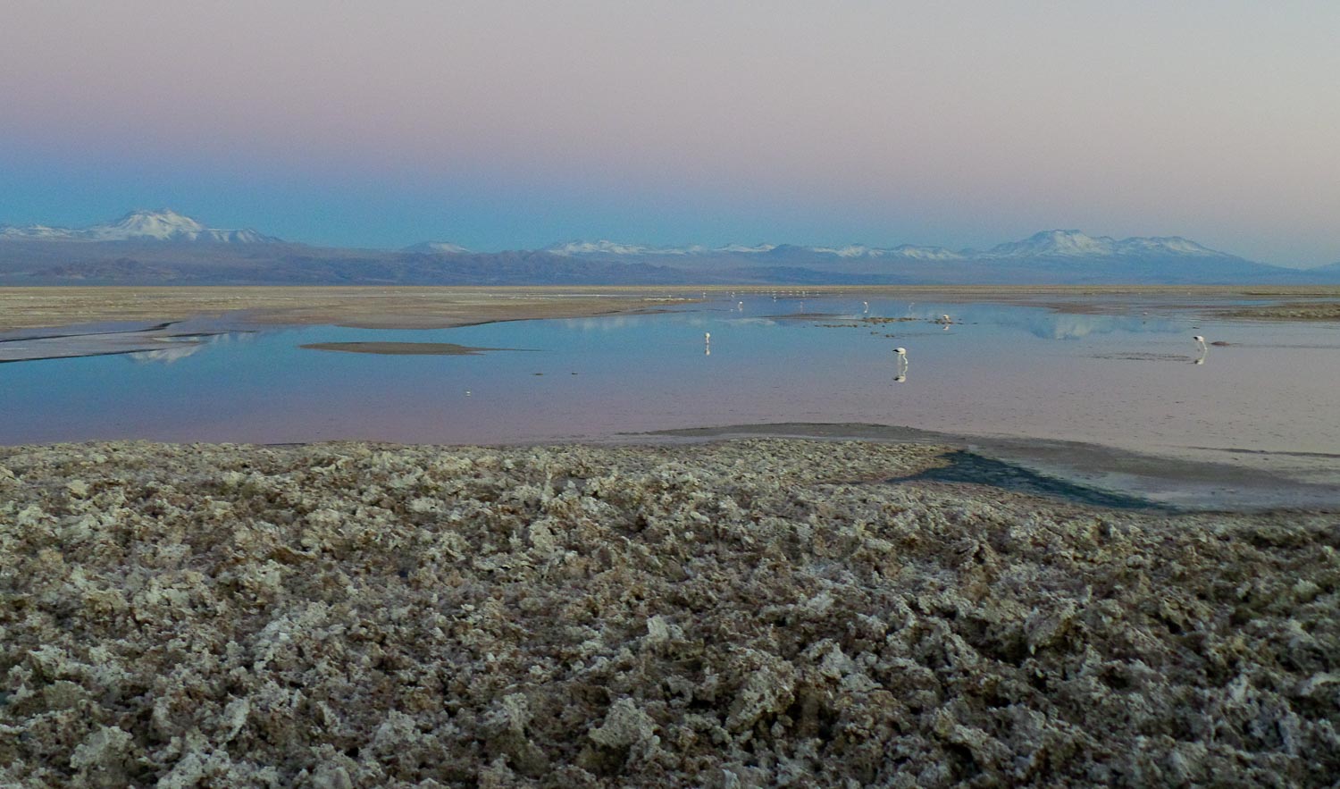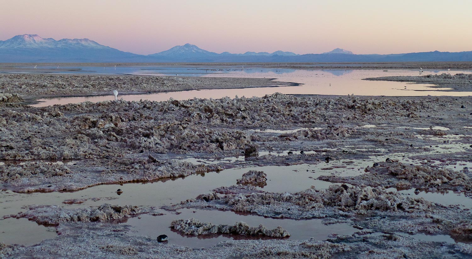 Around sunset, we drove to the lagoons in the salt flats to see the flamingos. They spent the entire time (and, to be fair, most of their lives) walking around in the lagoons, constantly feeding. It was a truly fascinating geographic area: salt flats and lagoons stretching as far as you could see, surrounded by mountains in every direction. Literally. There were 360 degrees of mountains.