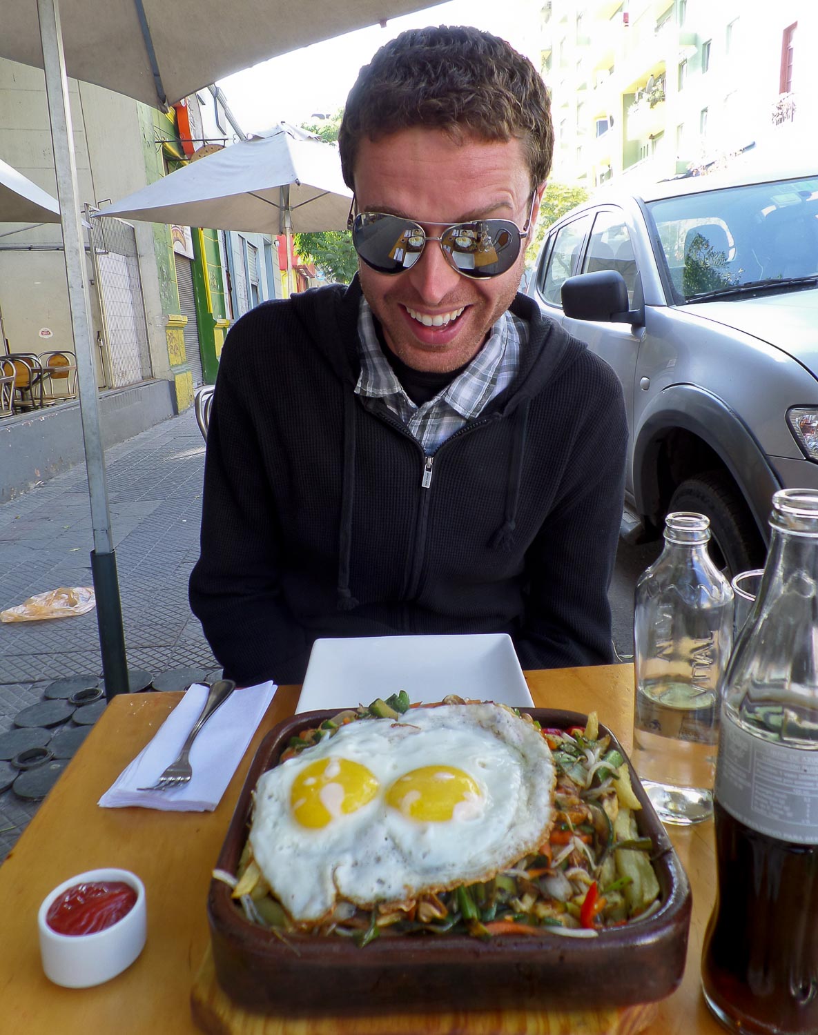 The next day we slept in after partaking a bit too much of the hostel’s inexpensive selection of wine. We rolled out around lunchtime and walked the neighborhood, finally settling on a place (D’Angelus) to grab some food. We shared some chorrillana, a traditional Chilean/Peruvian dish that is a layered parfait of french fries, beef, and fried eggs. Instead of beef, we had a layer of tasty sauteed veggies. The entire dish was massive and delicious and quite possibly the most perfect hangover food ever.