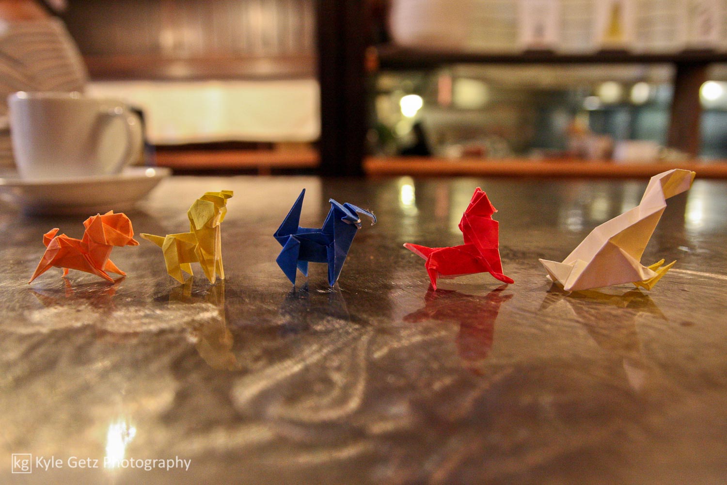 After going to Nijo Castle, we stopped in a cafe in the late afternoon and treated ourselves to some coffee and green tea spongecake. As we were the only customers in there, we started chatting with the two girls who were working and spent the rest of the afternoon helping them with their English and teaching them about America, made easier (and funnier) by using the Japanese tour book for America that they had on hand. Shortly before we left, they treated us to some cookies and our choice of a tiny animal origami piece.