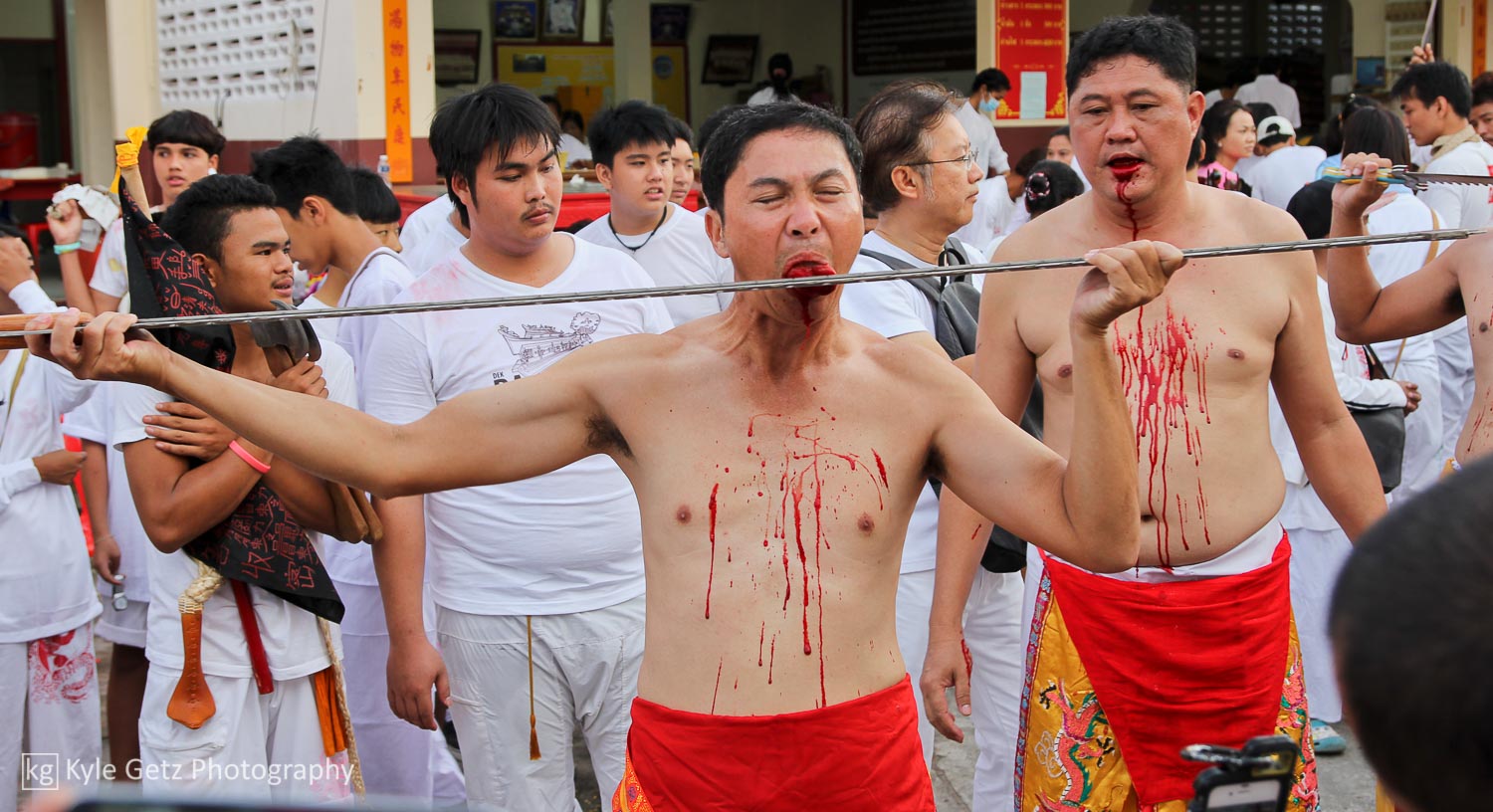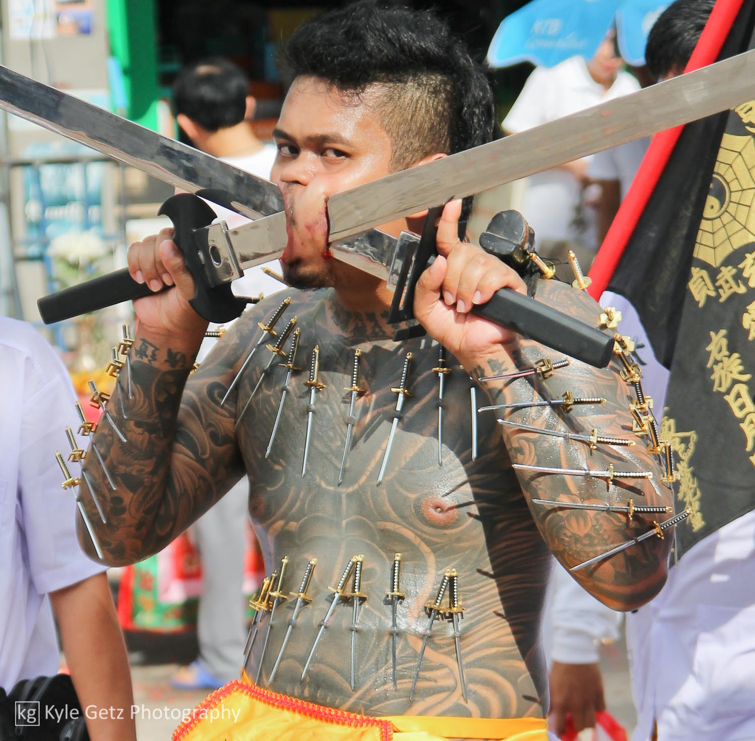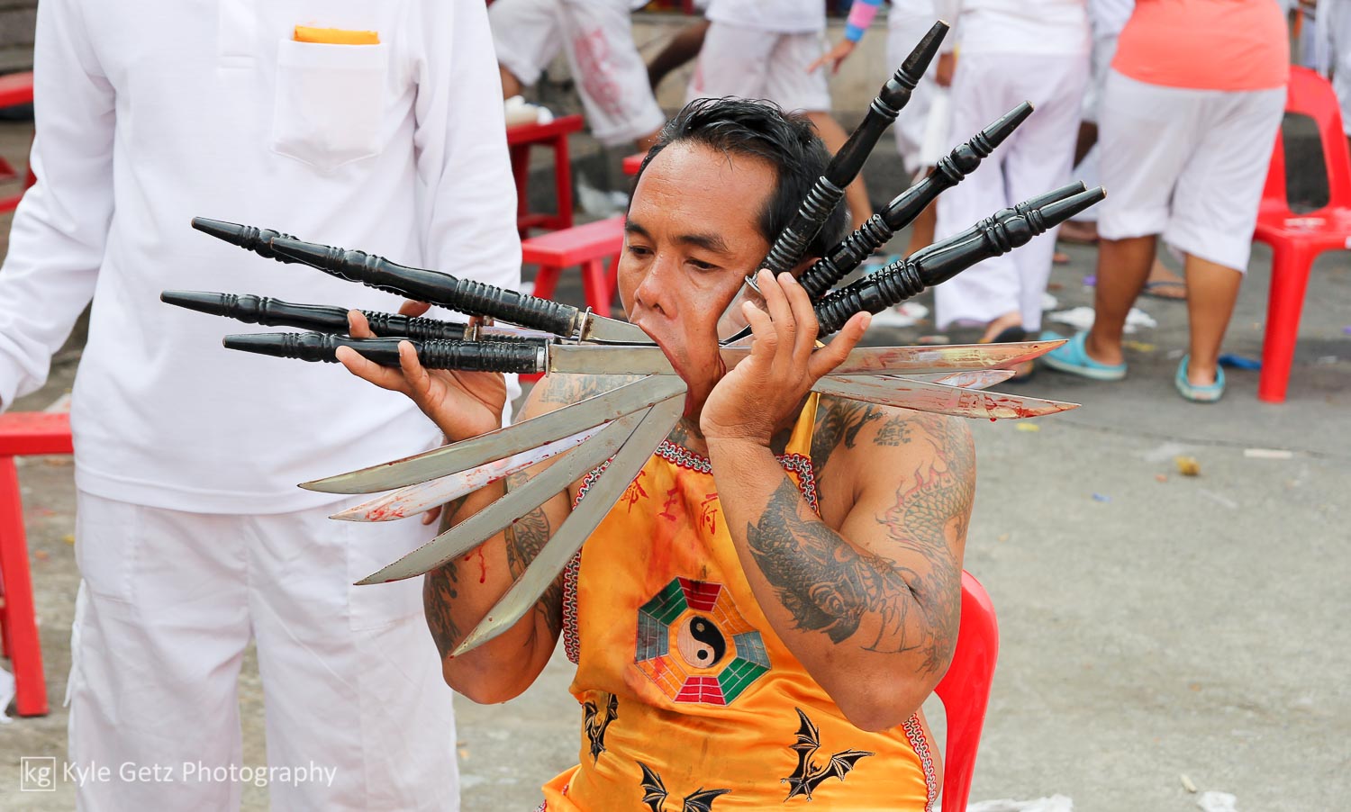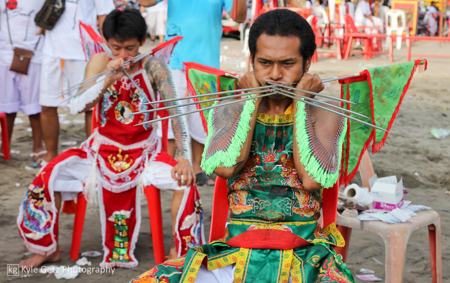 Shockingly, the mediums didn’t appear to feel any pain. Not a single one of them winced or flinched or anything, even when having a massive spike rammed through his face. Also, there wasn’t as much blood as I was expecting. Sure, there was the occasional puddle of blood on the ground or pile of blood-soaked tissues, but not as much as there should have been, considering what was happening. Not surprisingly, the same guys who participate in this also subscribe to tattoo culture. As you can see in the photos and videos, a lot of them have detailed and artistic full-back or full-sleeve tattoos.