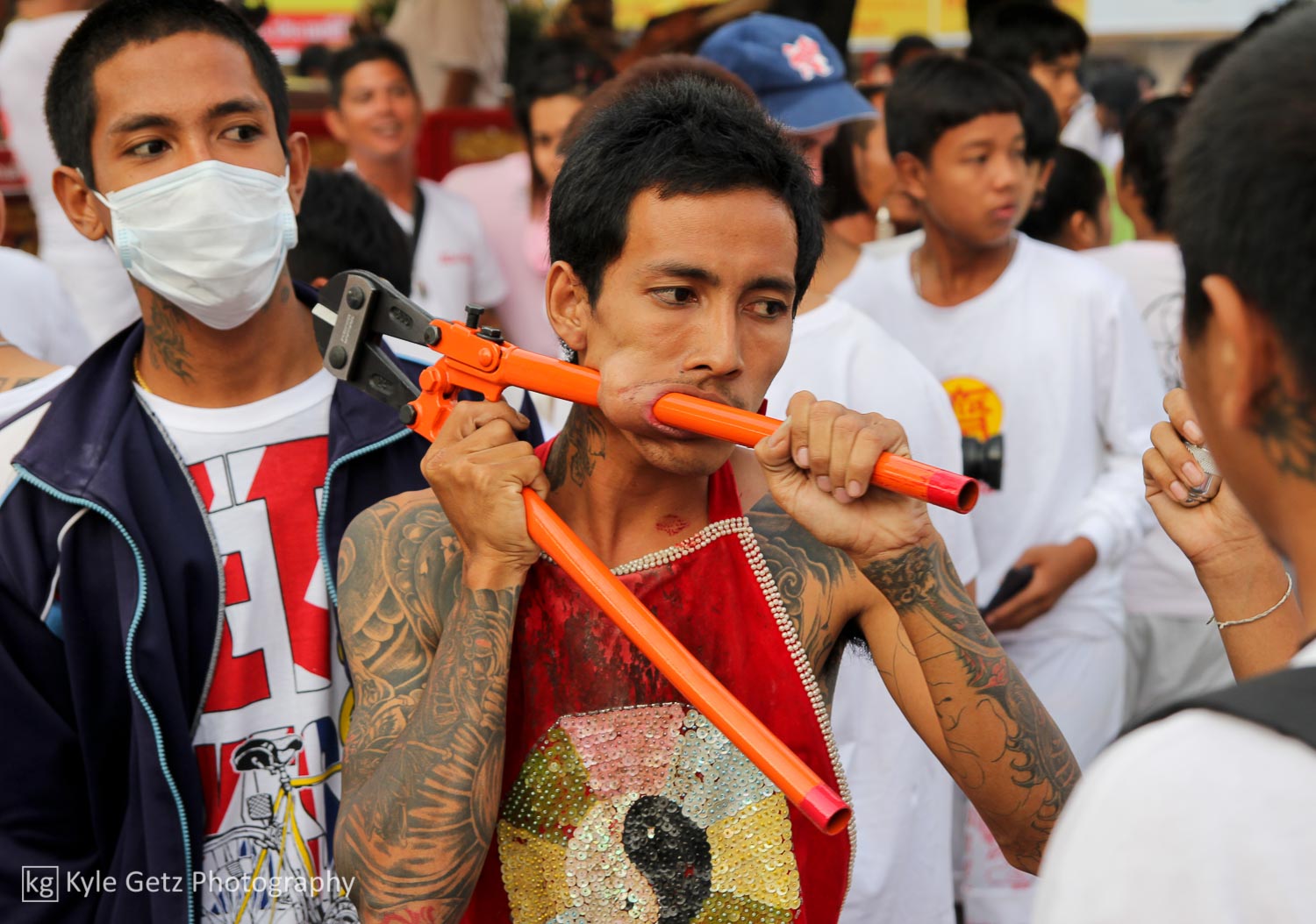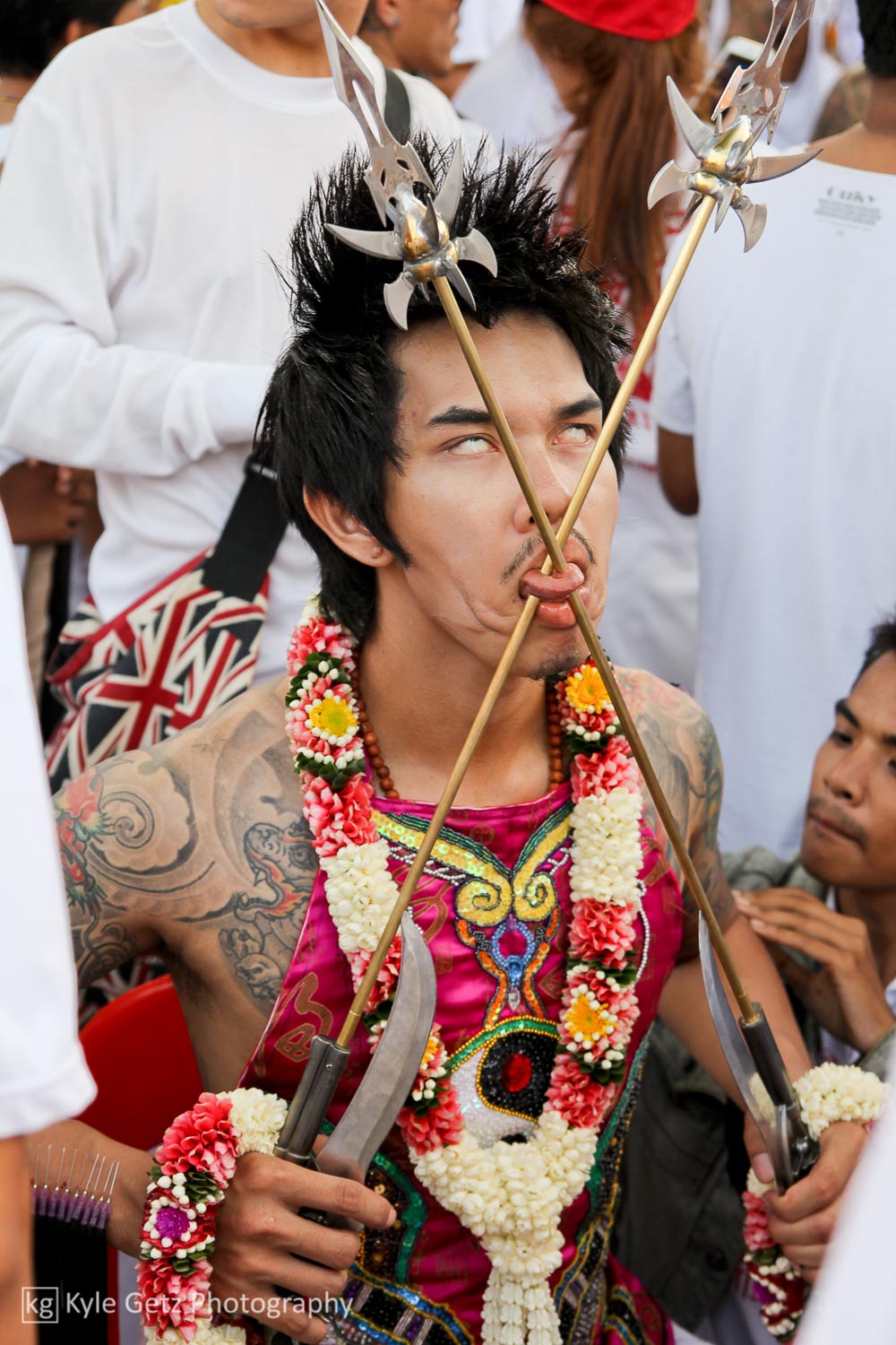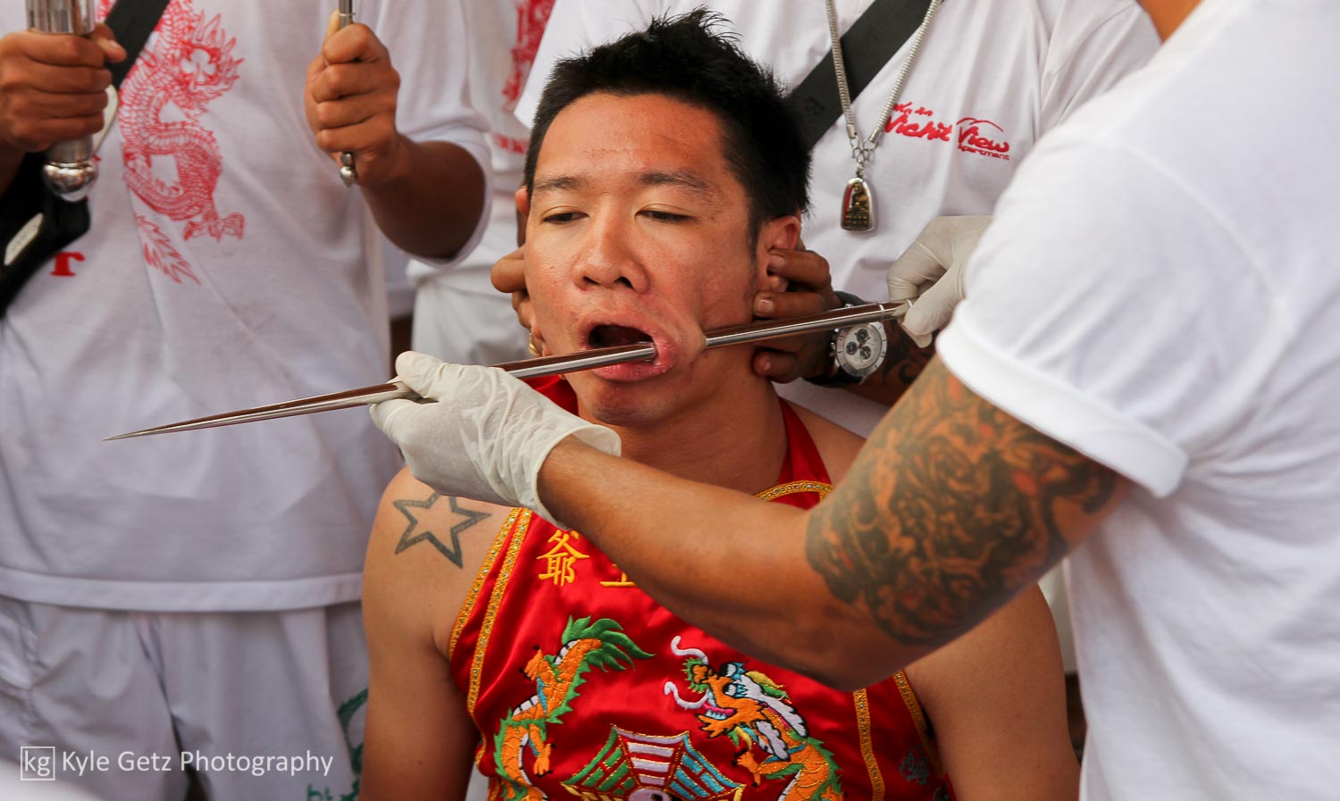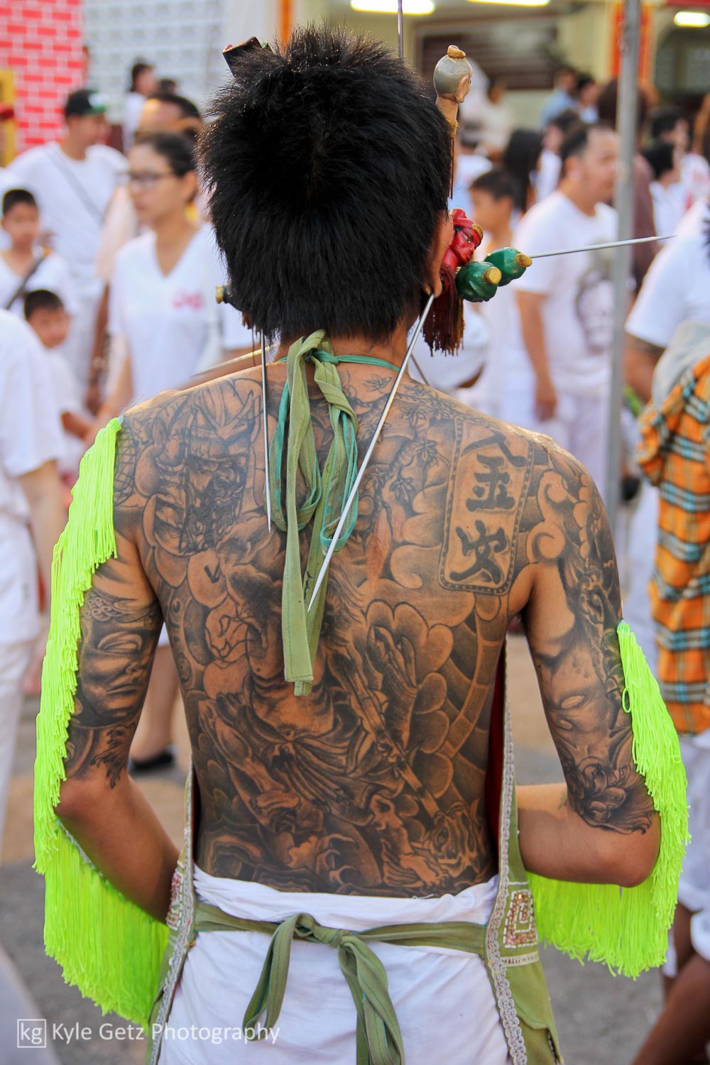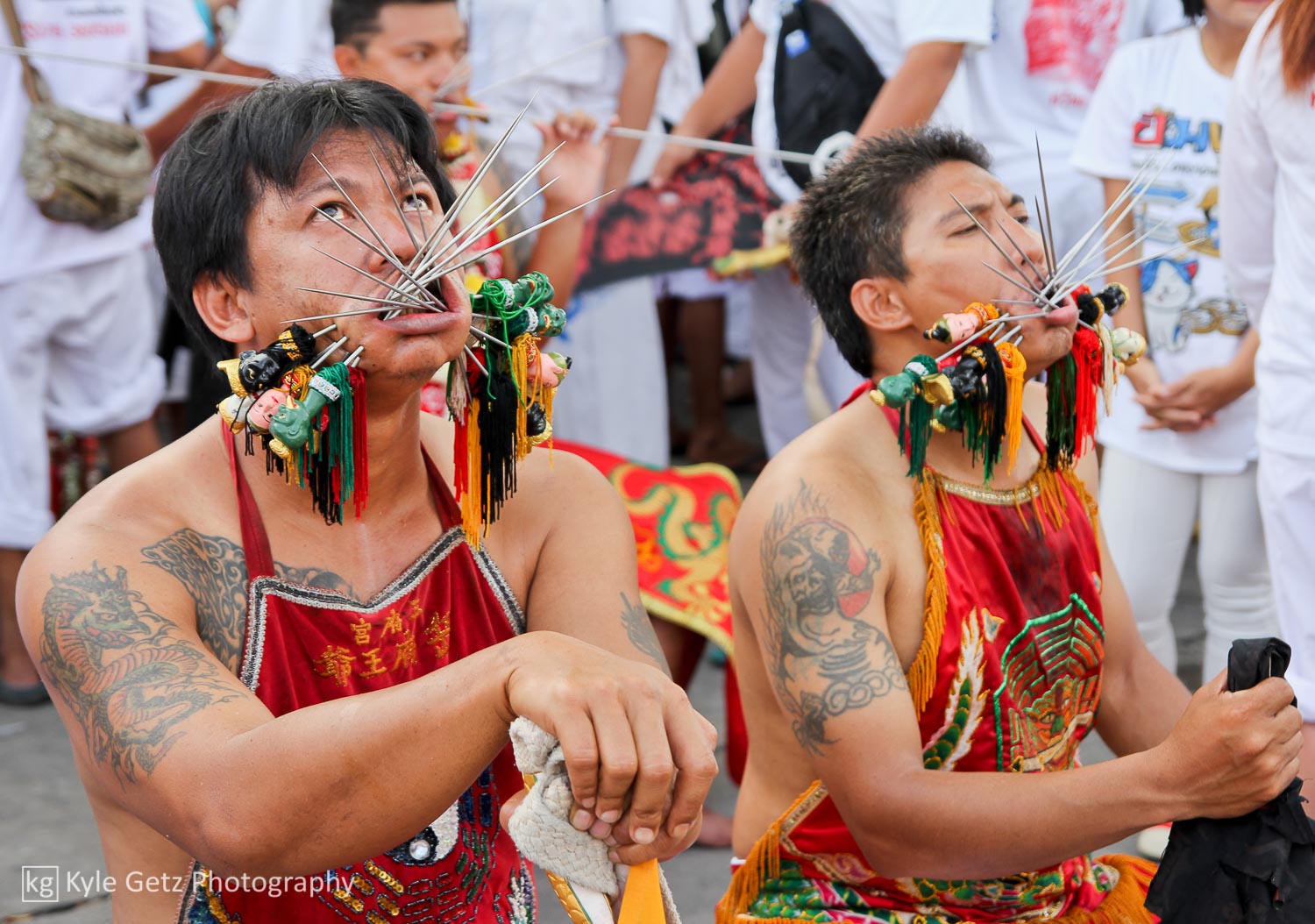 Shockingly, the mediums didn’t appear to feel any pain. Not a single one of them winced or flinched or anything, even when having a massive spike rammed through his face. Also, there wasn’t as much blood as I was expecting. Sure, there was the occasional puddle of blood on the ground or pile of blood-soaked tissues, but not as much as there should have been, considering what was happening. Not surprisingly, the same guys who participate in this also subscribe to tattoo culture. As you can see in the photos and videos, a lot of them have detailed and artistic full-back or full-sleeve tattoos.