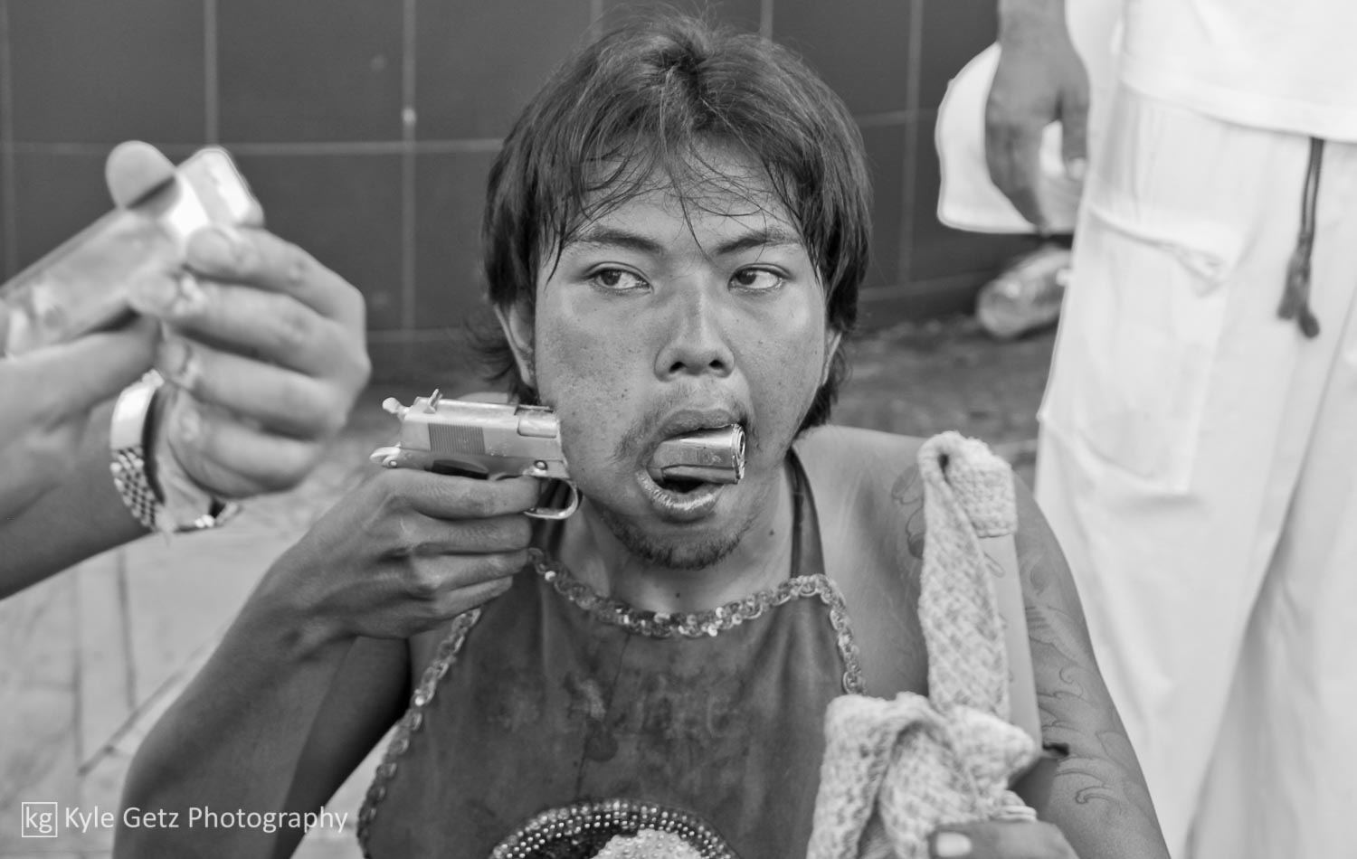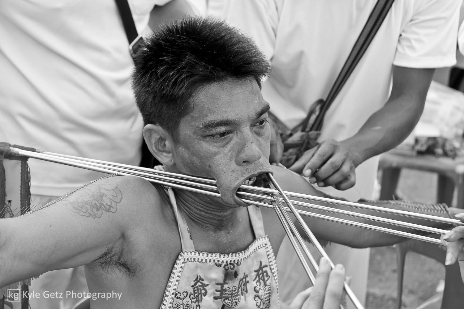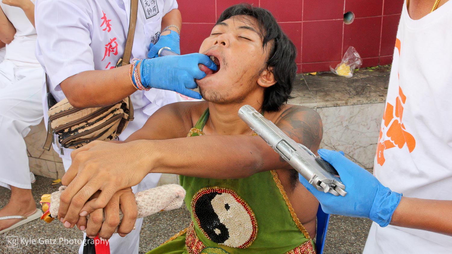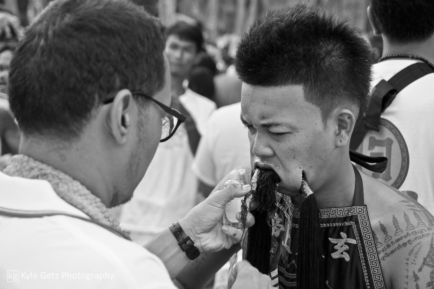 Shockingly, the mediums didn’t appear to feel any pain. Not a single one of them winced or flinched or anything, even when having a massive spike rammed through his face. Also, there wasn’t as much blood as I was expecting. Sure, there was the occasional puddle of blood on the ground or pile of blood-soaked tissues, but not as much as there should have been, considering what was happening. Not surprisingly, the same guys who participate in this also subscribe to tattoo culture. As you can see in the photos and videos, a lot of them have detailed and artistic full-back or full-sleeve tattoos.