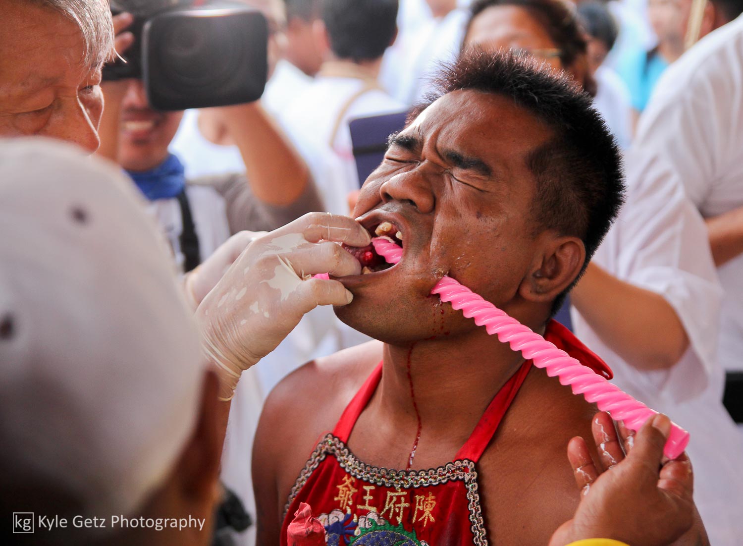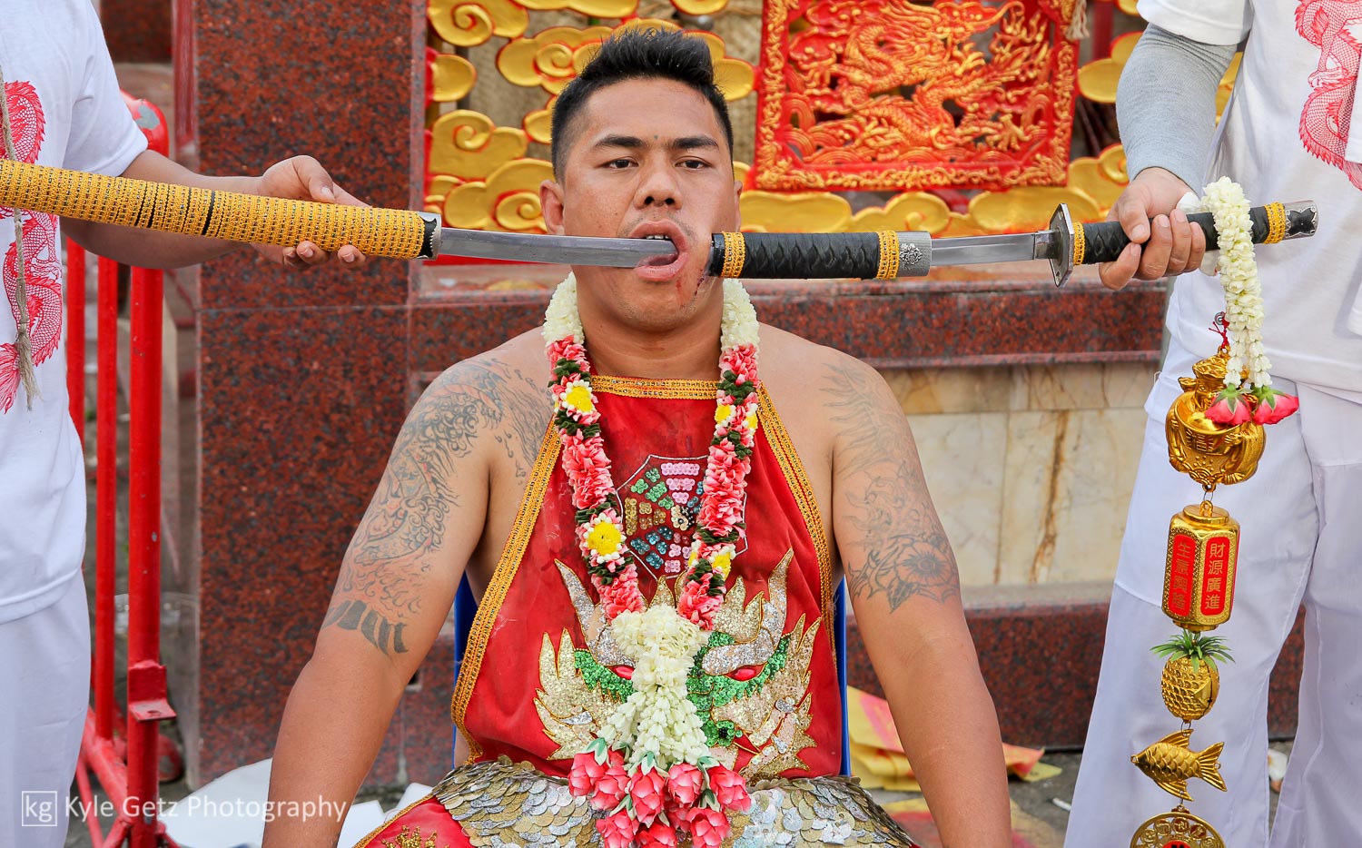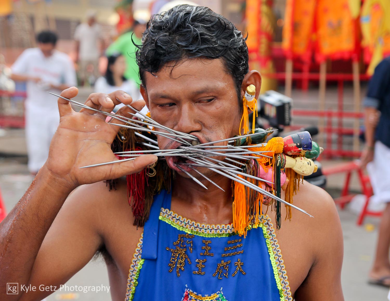 The most infamous aspect of the vegetarian festival is the mutilation. Again, it’s not clear how this tradition started, but it falls within the same realm of purifying the body and appeasing the gods. The rituals take several forms: self-inflicted wounds, firewalking, climbing the “knife ladder”, and body piercing. The piercing is by far the most popular activity and is also what tends to appear in Google Images search results. Most of the piercing is done through the cheeks with metal spikes, after which another object is inserted into the hole. It seems that the mediums try to outdo themselves and each other every year with crazier or more intense piercings. A few mediums were pierced through the tongue, neck, or arms instead of (or in addition to) the cheeks. The piercings happen at the temples early in the morning and then the mediums walk in the processions for everyone to see.