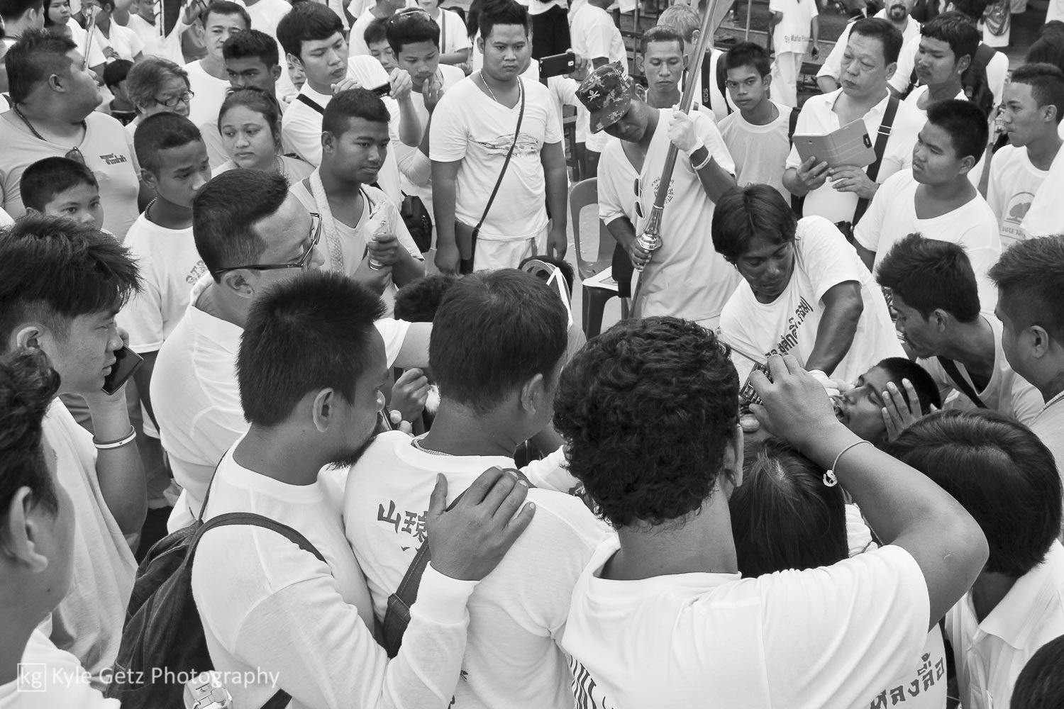 On Monday, I woke up at 5:00 so I could make it to Bang Niao, one of the temples in Phuket Town, by about 6:00 for the piercings. There were a lot of people, including a lot of photographers and videographers (Thai and farang), but it was still fairly easy to see a lot of the piercings up close since there were so many mediums. A lot of the men who were administering the piercings had noticeable scar tissue in their cheeks from participating in years past.
