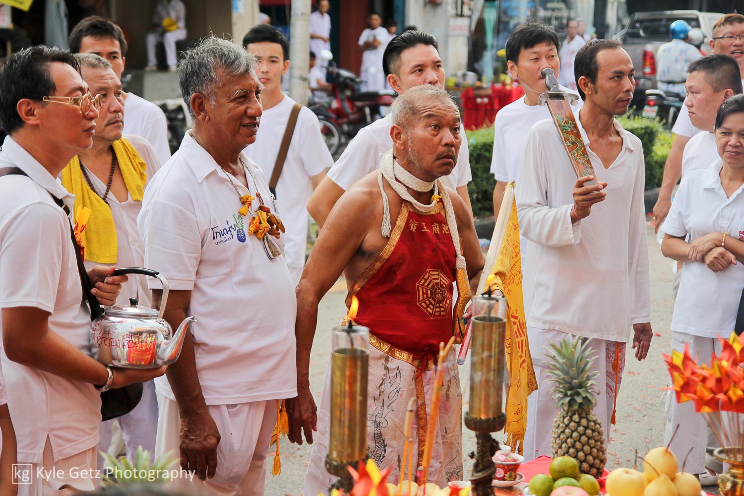 During the festival, many people (mostly men, but a few women) act as mediums for the gods. For the nine days, they are possessed by spirits, sometimes go into trances, chant, bark, shake, crack whips, dance, participate in the ceremonies, and are treated with the utmost respect by everyone in attendance. Each medium is always accompanied by an entourage. For the processions, families will arrange small, red-tablecloth-covered tables on the sidewalk along the procession route; these tables will have small offerings (food and drink), incense, Buddhas, and the like. The mediums walking in the procession will occasionally stop by these tables, partake of the offerings, possibly leave some small gifts for the family, and offer blessings.