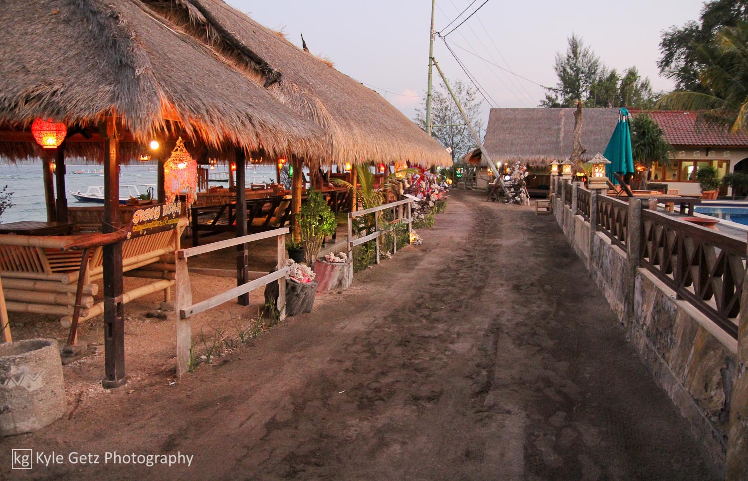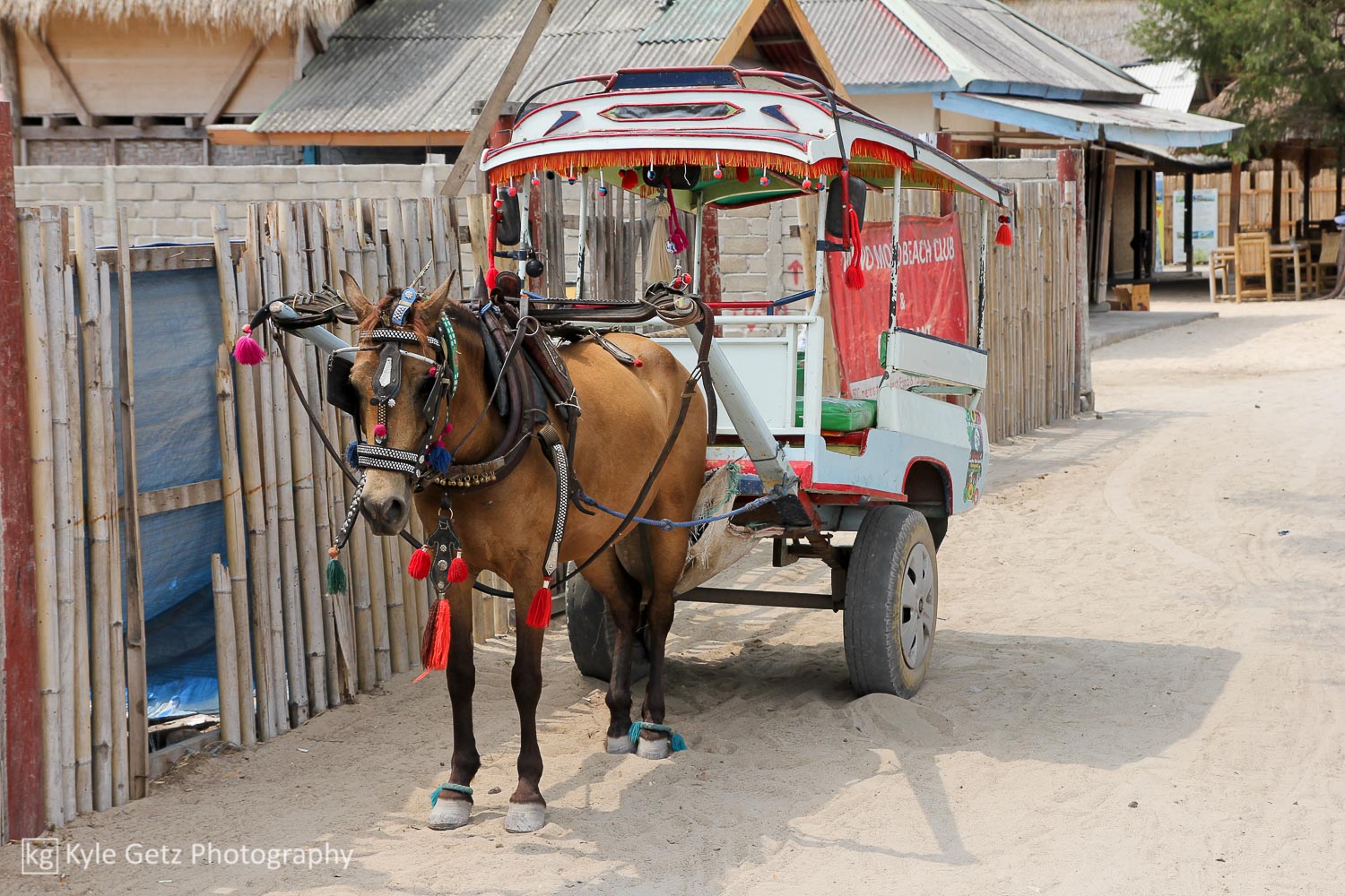 The islands are a delightful departure from the standard beachy tourist experience for a variety of reasons. While the perimeter of each island is dotted with bars, restaurants, and shops for tourists, the interior of each is very much an authentic Muslim village, with simple huts, farms, animals, and mosques. I quickly acclimated to sharing the winding dirt roads with farm carts, children on bikes, cows, horses, small tribes of goats, chickens, and tail-less cats. (Thankfully, there are no stray dogs on any of the islands.) Motorized vehicles are not allowed, which is the main reason why the islands are so serene and peaceful. The only form of “public transportation” is the cidomo, a horse-drawn cart whose only contribution to noise pollution is the clip-clop of hooves and the jingling of small bells.