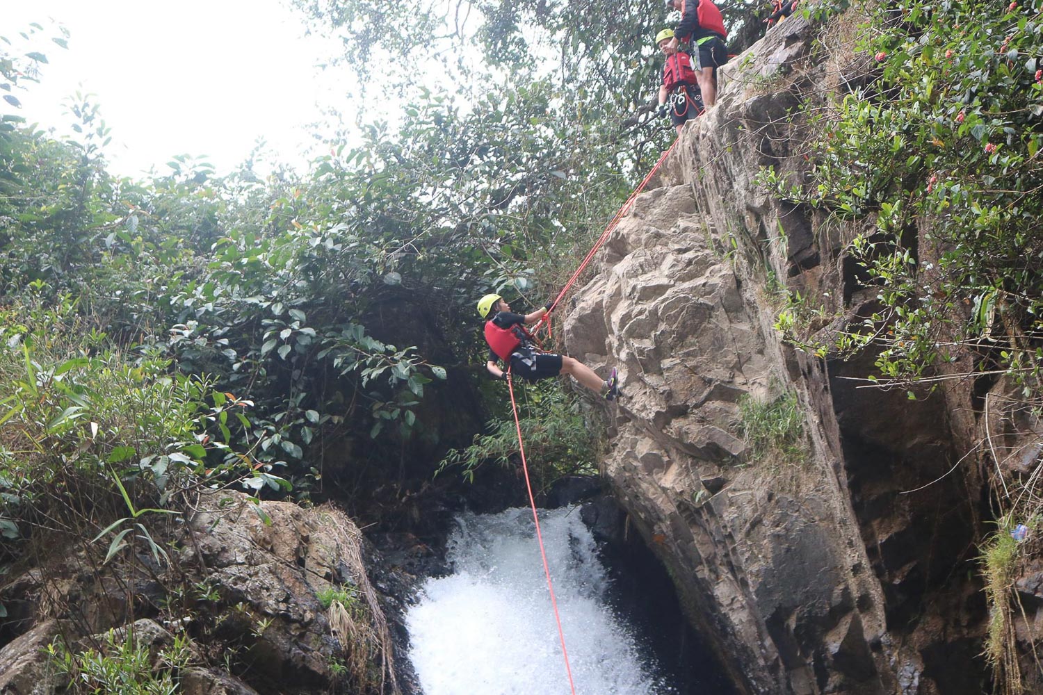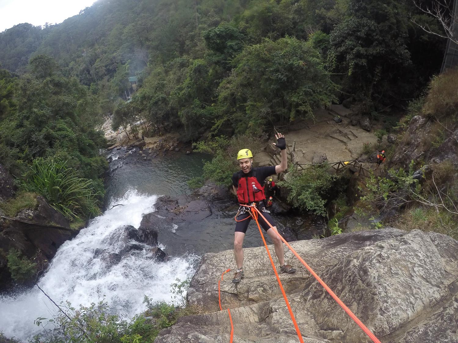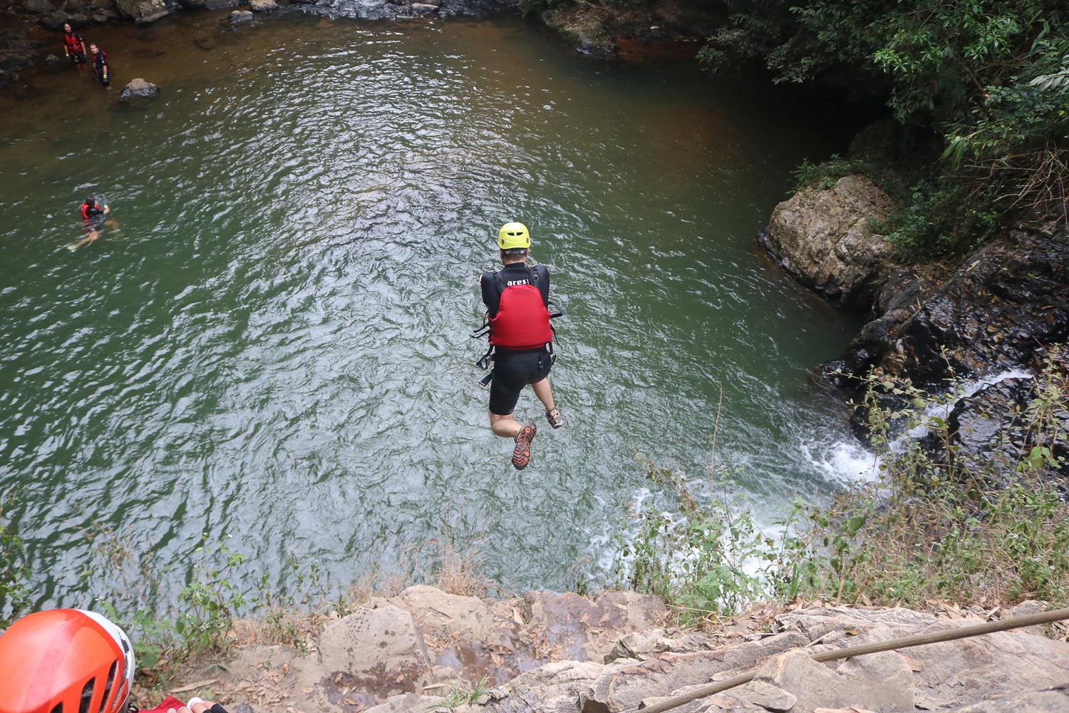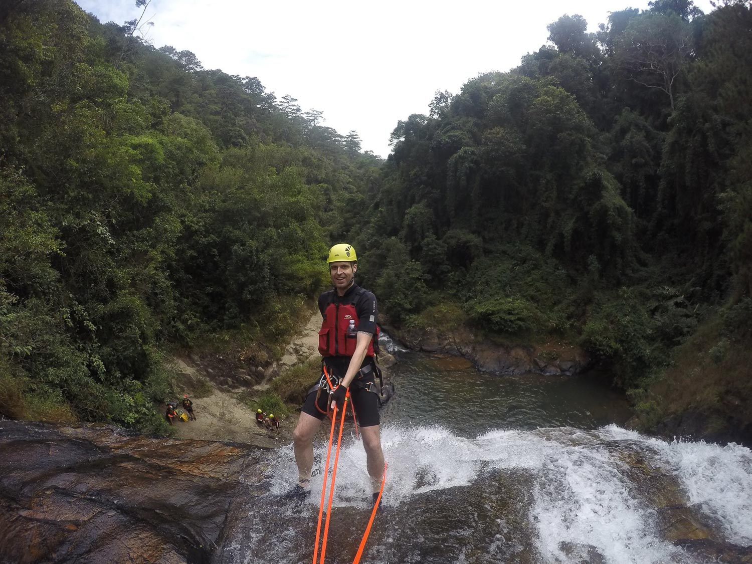 After trekking a bit into the woods and losing most of the crowds, we finally came to the first waterfall. As with all the waterfalls that day, one of the guides gave us a briefing on any specifics before anything else happened. For this first waterfall, we would lean back and slowly walk down, just as we had practiced, until one of the guides gave a (verbal) signal that we should start jumping our way down. Once we got within a few feet of the river below, he would give another signal and we would let go of the rope entirely and fall into the river.