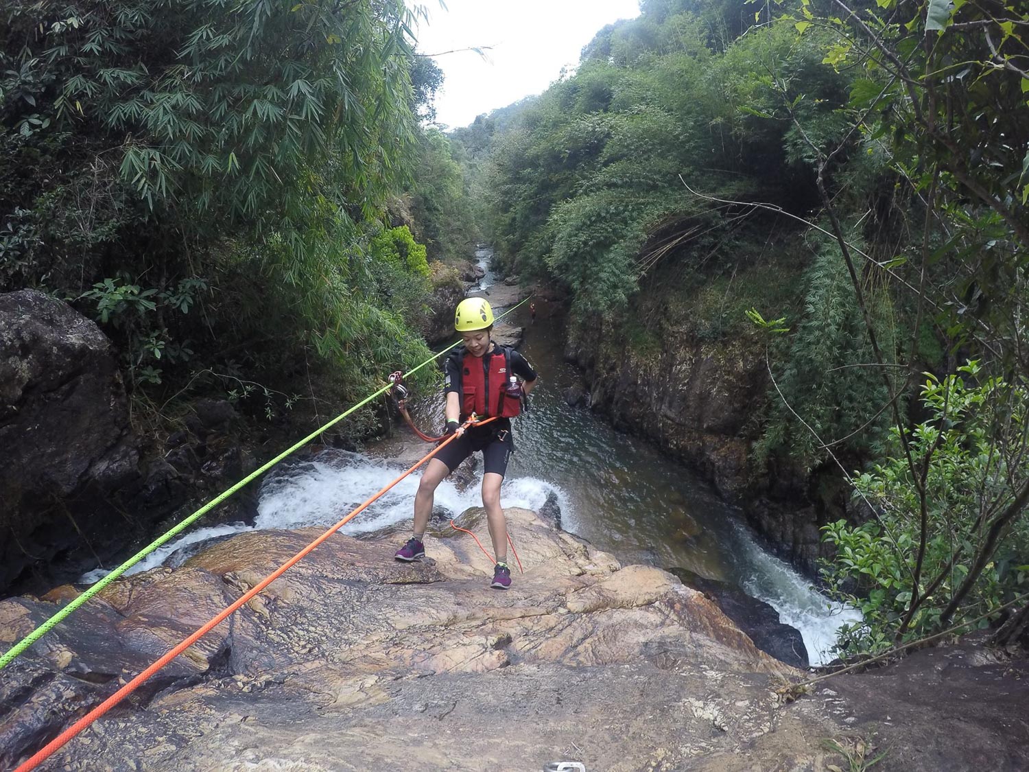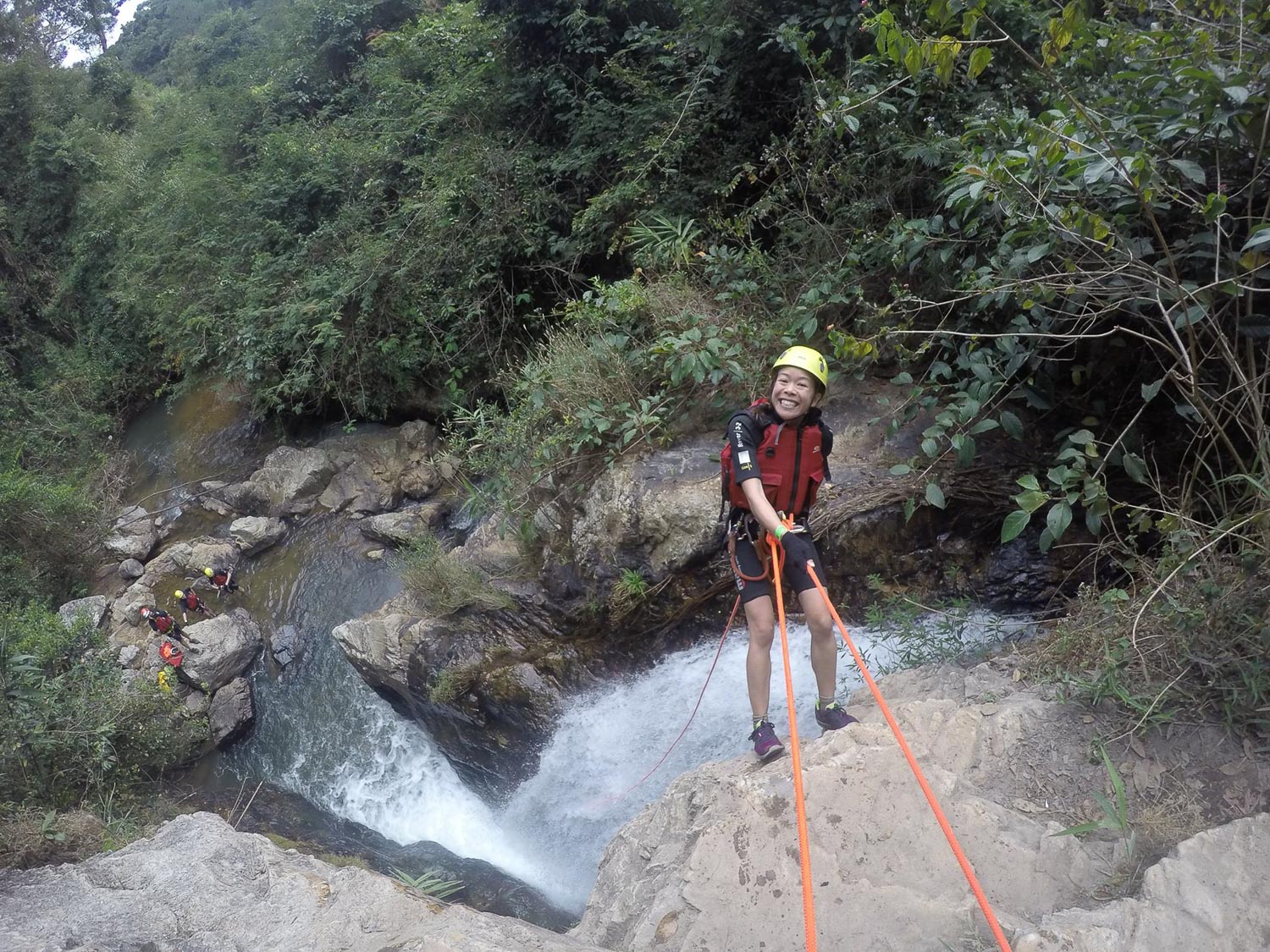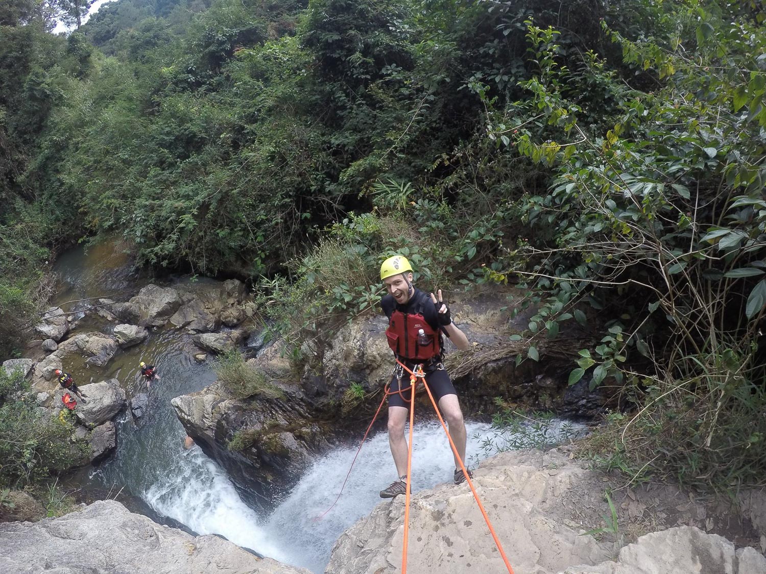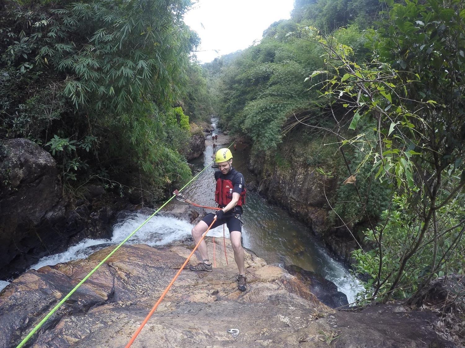 After everyone from both groups finished their jumps, we all had a picnic lunch in the woods with Vietnamese sandwiches, banana bread, fruit, and even some actual sunshine! By the end of the meal, we were all well-fed and I was finally almost warm. The next waterfall – affectionately known as the “washing machine” – was the last of the day. It was almost the same height as the previous one, but required a descent into a crevasse. We walked down the cliff for only about half of the descent; for the other half, we dangled in the air and continued to lower ourselves with our hands, even while going through the waterfall and getting battered and disoriented by the running water (hence the name). Eventually the rope ran out, at which point we let go entirely, crashed down into the river, and let the current carry us away from the cliff.