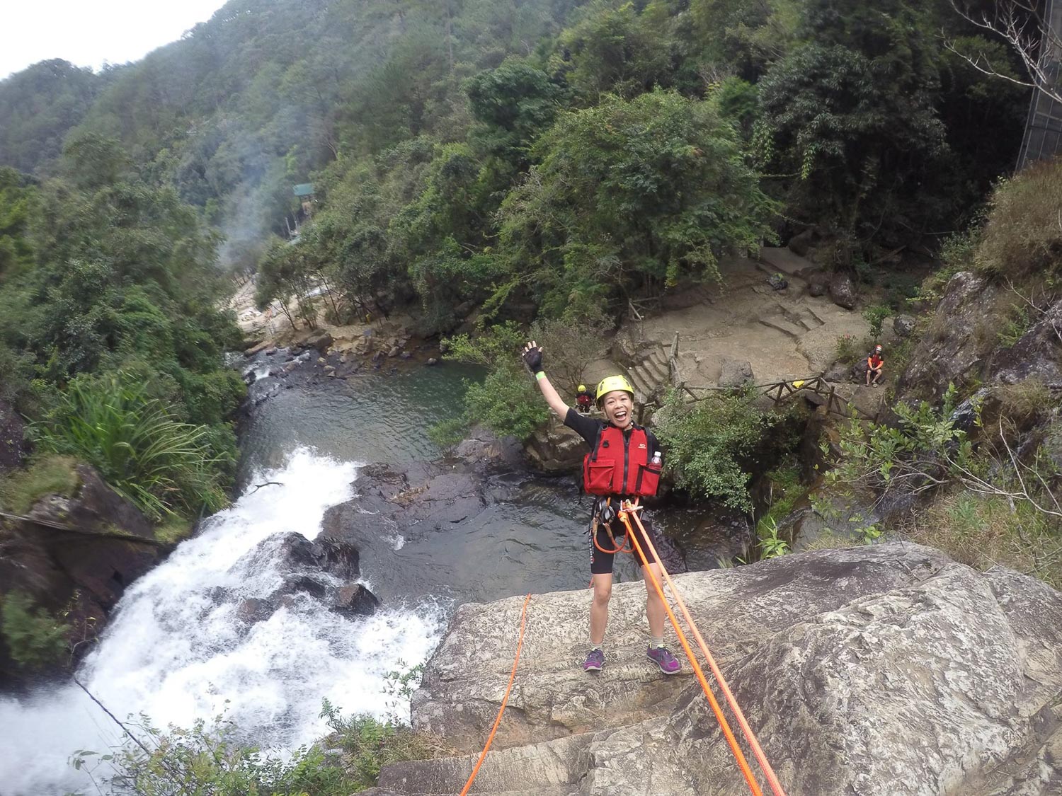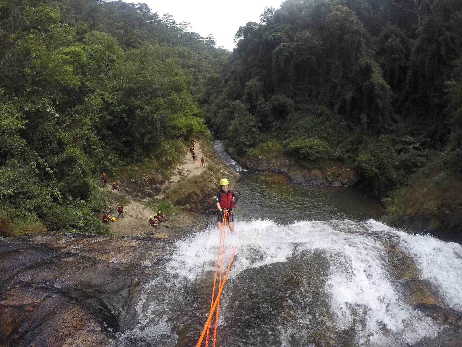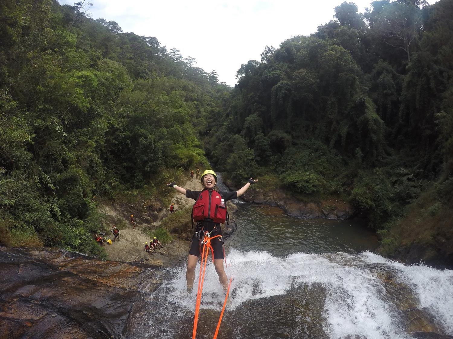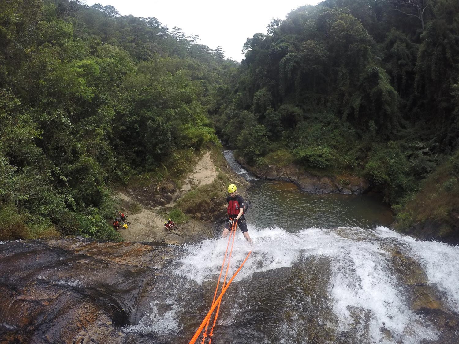 After everyone from both groups finished their jumps, we all had a picnic lunch in the woods with Vietnamese sandwiches, banana bread, fruit, and even some actual sunshine! By the end of the meal, we were all well-fed and I was finally almost warm. The next waterfall – affectionately known as the “washing machine” – was the last of the day. It was almost the same height as the previous one, but required a descent into a crevasse. We walked down the cliff for only about half of the descent; for the other half, we dangled in the air and continued to lower ourselves with our hands, even while going through the waterfall and getting battered and disoriented by the running water (hence the name). Eventually the rope ran out, at which point we let go entirely, crashed down into the river, and let the current carry us away from the cliff.