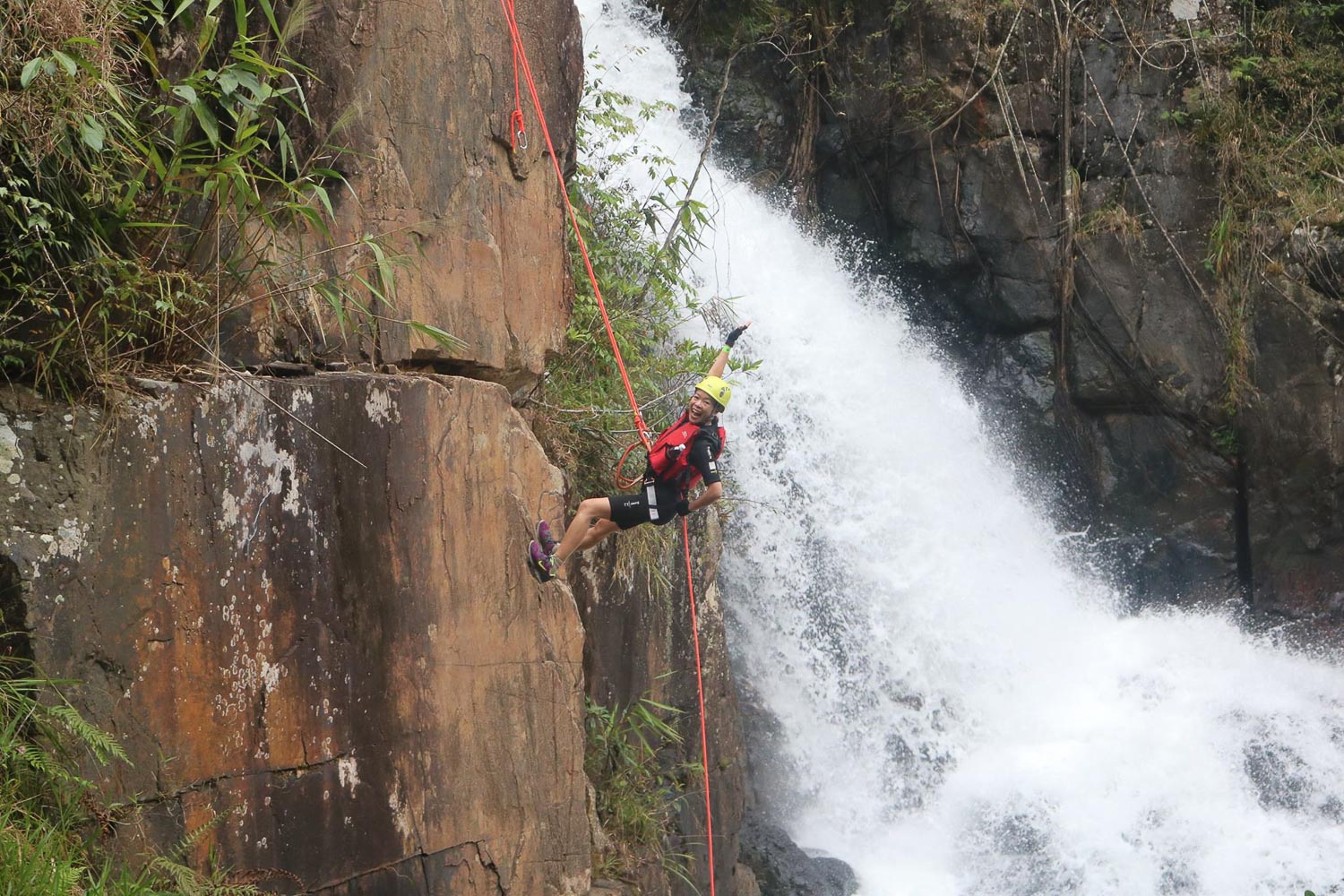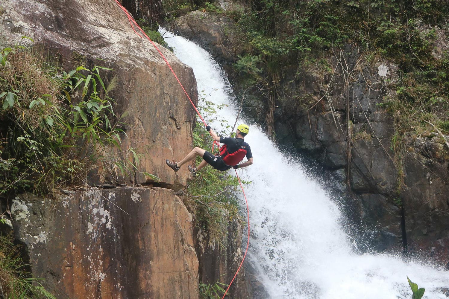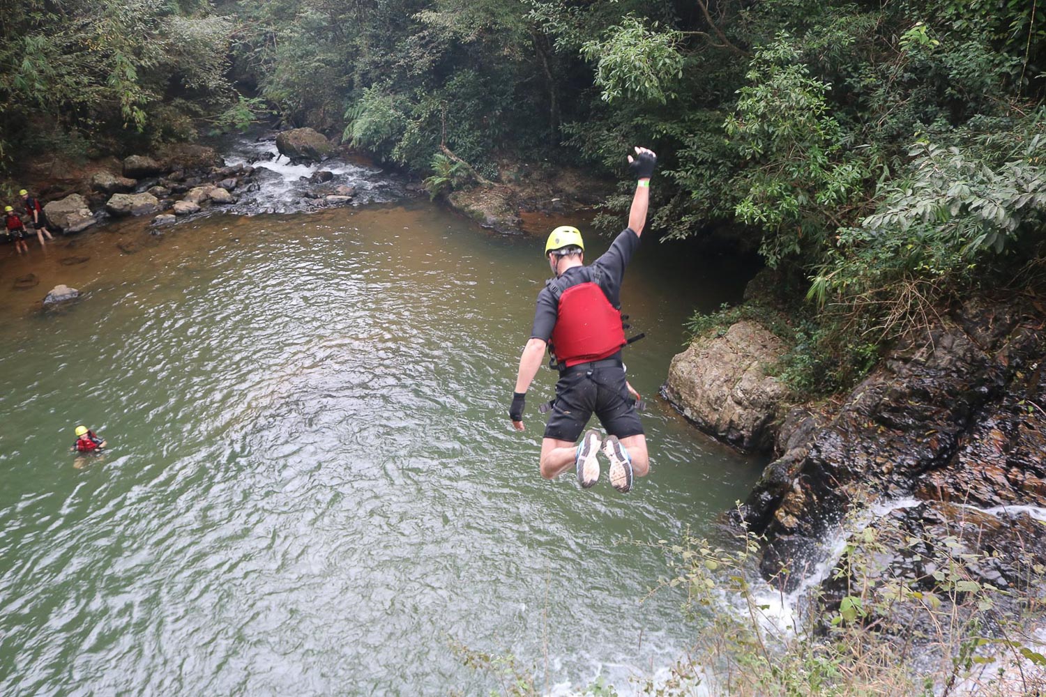 After a couple rounds, everyone felt comfortable enough, so we gathered up all our gear and made our way through the park to the first waterfall. We passed dozens, if not hundreds, of Vietnamese tourists on the path who were bundled up in clothing that was appropriate for the weather. They were visiting the park to enjoy the other – much more tame – activities and watched us with fascination as we descended the steps in our wetsuits and life jackets and helmets.