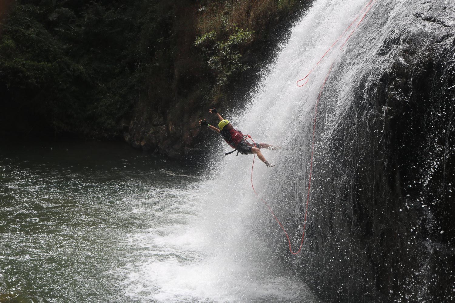 The next waterfall was the tallest of the day: 25 meters, with a relatively slow descent, capped off by a 7-meter drop into the river below. Evidently the rocks are so slippery on this descent that wearing shoes is actually a hindrance, so we all ditched our shoes and waded through the water in our socks to the edge of the cliff. We each walked down the cliff slowly, especially since the water was hitting us in the face. Once we reached the appropriate stopping point, the guide off to the side would yell for us to stop, then begin the countdown for our plunge.