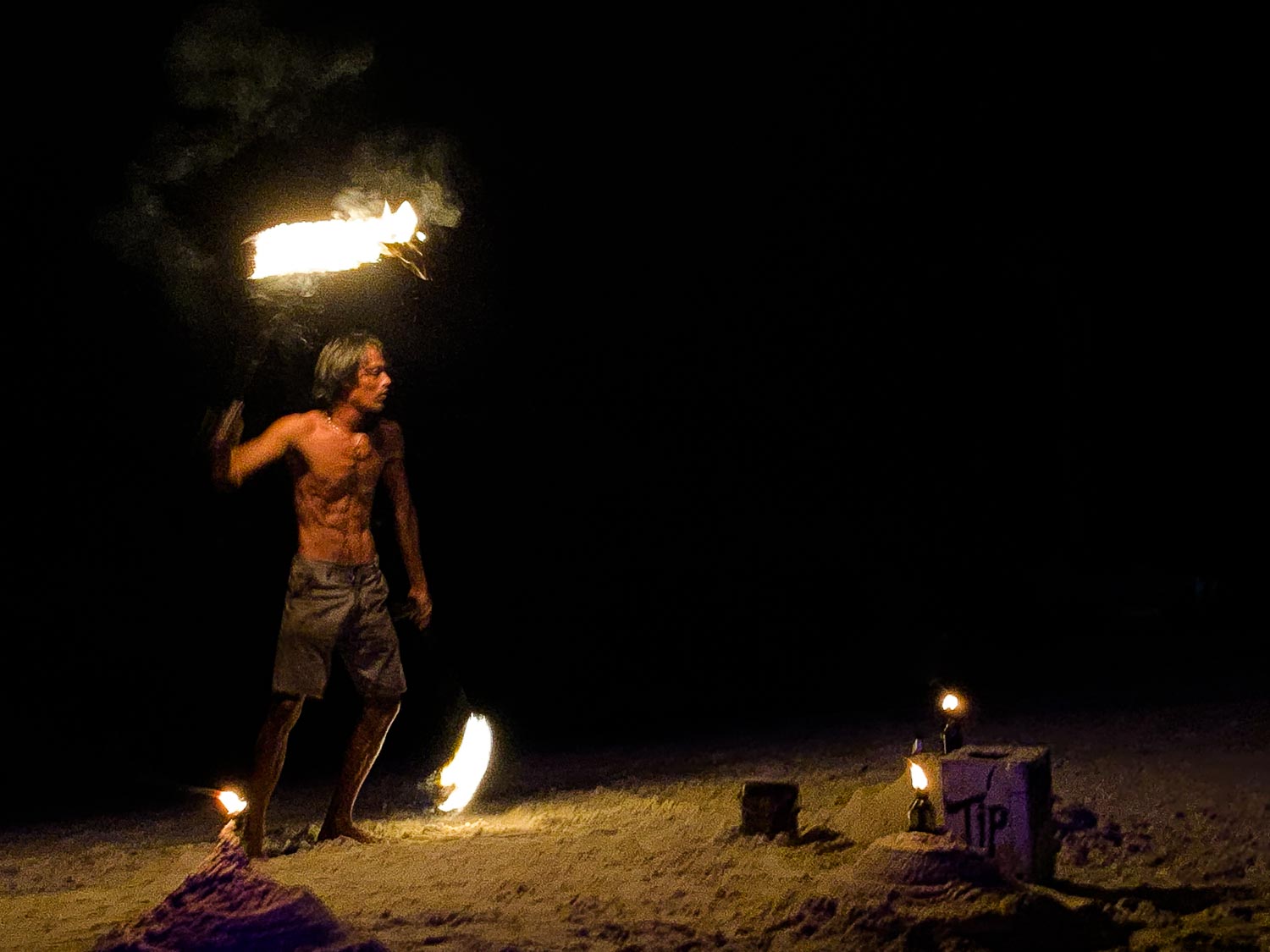 Wednesday was a classic beach day – sun and sand and surf all day long. We went to the reggae bar in the evening and smoked a joint of crappy who-knows-what and watched the light and shadows of the fire poi in front of us.